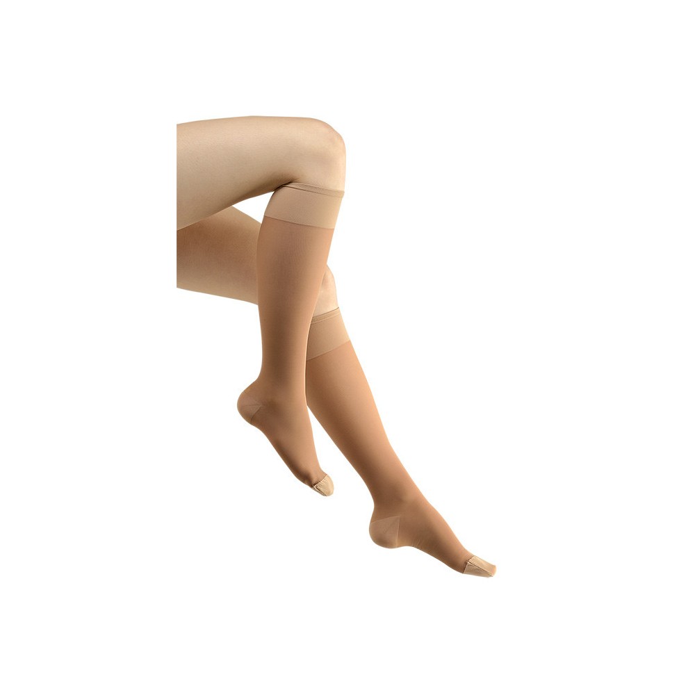 Mechanizm działania kompresyjnych wyrobów medycznych polega na działaniu precyzyjnie określonego stopniowanego ucisku na kończynę dolną, który stopniowo zmniejsza się od kostki w kierunku serca. Ciśnienie w okolicy kostki w punkcie b (patrz tabela rozmiarów) jest najwyższe i osiąga wartości 18 – 21 mmHg.Aby osiągnąć pożądany efekt, konieczny jest wybór odpowiedniego rozmiaru.